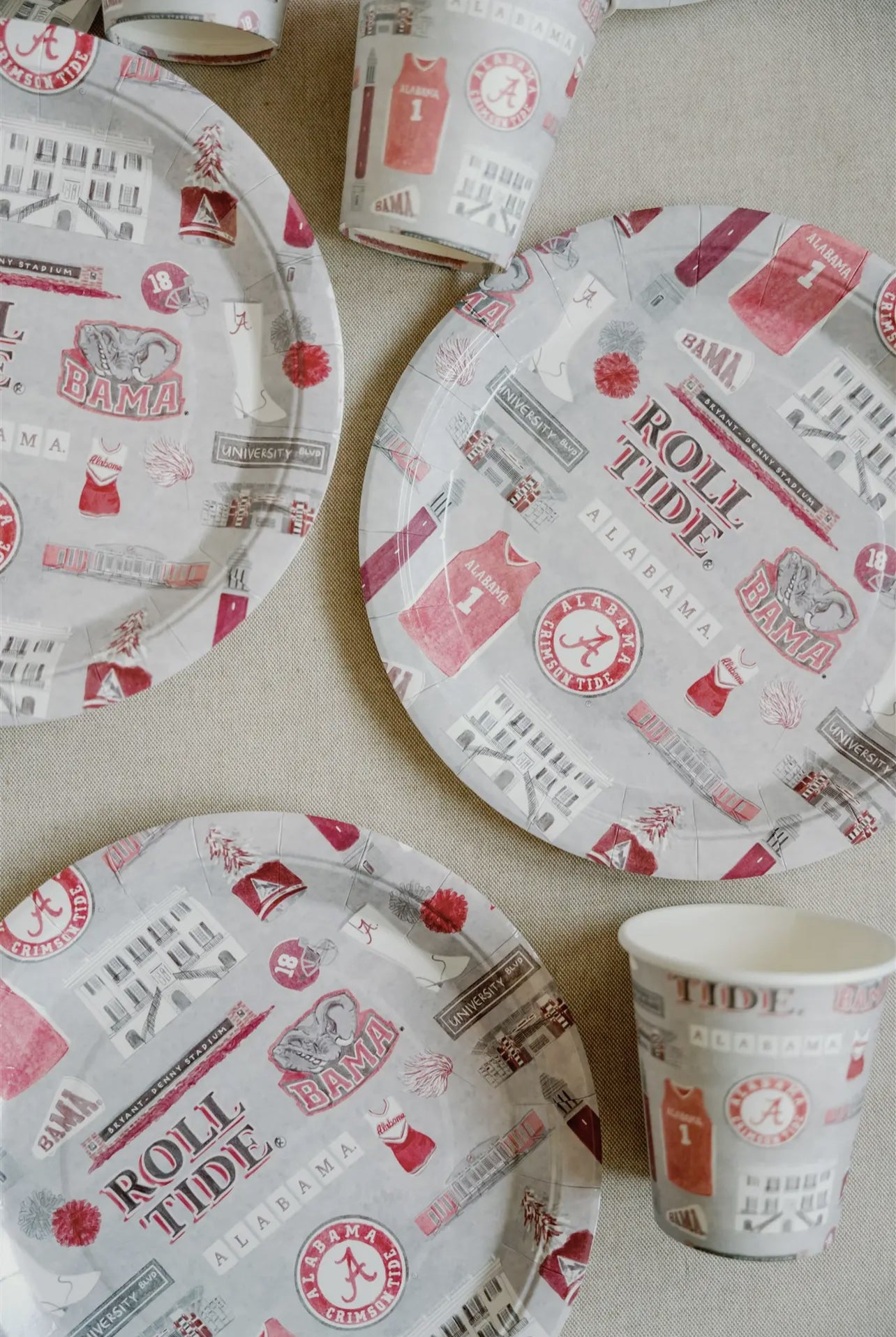 - Features watercolor images of Bryant- Denny Stadium, the President's Mansion, a Crimsonette boot, and Alabama logos! Perfect for fall tailgates or graduation parties!